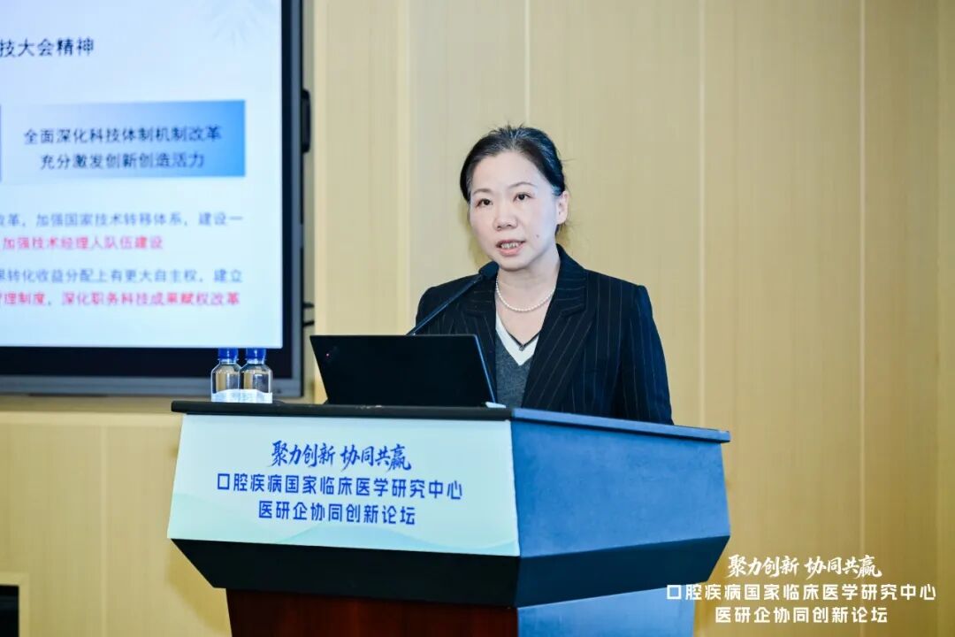 论坛同步聚焦临床转化实践前沿,我院口腔正畸科主任房兵、口腔颌面头颈肿瘤科主任何悦、口腔外科主任陈敏洁、口腔颅颌面科副主任林开利,分别结合各自科室在人工智能临床转化、肿瘤特色诊疗与转化、专利转化实践、学科交叉融合等领域的探索,分享了以临床需求为导向、以有组织科研为路径、以高效成果转化为目标的具体实践案例。