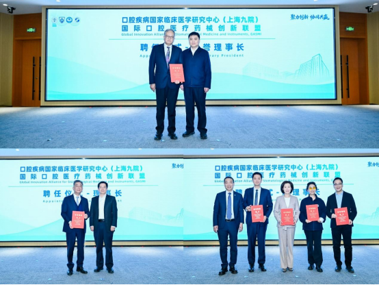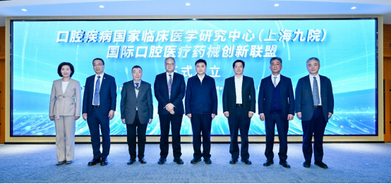 在与会嘉宾的见证下,中国工程院院士、国家口腔医学中心(上海)名誉主任、口腔疾病国家临床医学研究中心(上海九院)名誉主任张志愿、顾金辉主任、胡鸿毅副主任、郭术廷副局长、马延斌书记、杨驰主任、上海市生物医药产业促进中心主任刘厚佳、上海交通大学医学院附属第九人民医院副院长、上海交通大学口腔医学院党委书记徐袁瑾等共同启动“口腔疾病国家临床医学研究中心(上海九院)-国际口腔医疗药械创新联盟”正式成立。