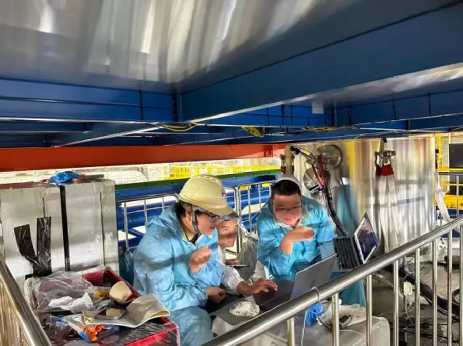 8月25日上海交大博士后惠加琪(右一)、博士生李瑞(左一),博士生张平(中间)在正式物理取数前进行全面刻度