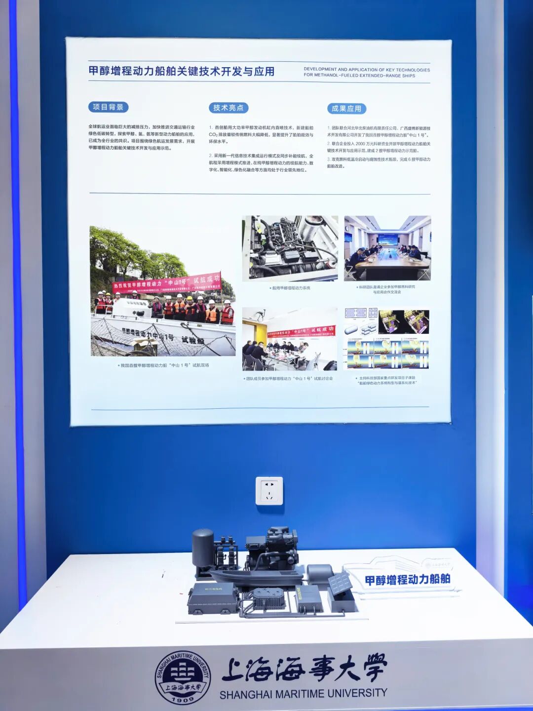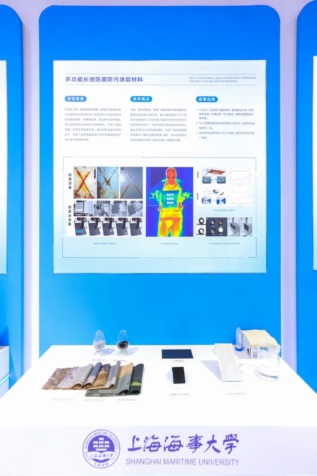 此次海事大学参展成果有船舶能效数据监测与碳排放管理平台、大型起重机械状态监测与评估系统、港口数字孪生智能管控系统、甲醇增程动力船舶关键技术开发与应用、浮潜式海洋温差能发电系统、多功能长效防腐防污涂层材料、海事云数据基座引擎技术、船舶现代海洋天文导航装置、船舶水动力节能装置-桨前预旋导流罩,涵盖智慧港口、船用新能源、绿色航运、智慧航运、海洋新能源、新材料等领域,是学校对接服务交通强国、海洋强国战略和上海国际航运中心建设,践行“重服务、强贡献”理念的集中体现。