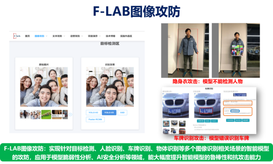 F-LAB神经网络攻防平台包括图像攻防、文本攻防、语音攻防等。在图像攻防方面,平台展示了目标检测、人脸识别、车牌识别、物体识别等多个场景下人工智能算法和模型的安全性,通过生成图像域、物理域等多种形式的对抗样本,验证人工智能算法和模型的脆弱性,并提供多种对算法模型进行防御加固的方法。在文本攻防方面,平台展示了文本情感分析、机器翻译、文本推荐、垃圾邮件过滤等多种场景下人工智能算法和模型的安全性。在语音攻防方面,平台展示了音色分类、语音识别等多种场景下人工智能算法和模型的安全性,通过生成相似的对抗音频造成算法和模型出错。