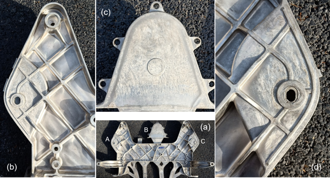 图3AE44M镁合金副车架铸件外观照片: (a)整体形貌; (b)a图中A位置放大图; (c)a图中B位置放大图; (d)a图中C位置背面放大