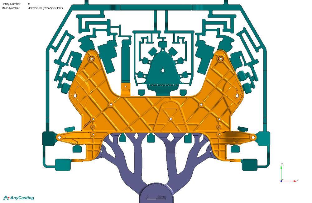 镁合金汽车副车架铸件由东风汽车公司设计,由上海交通大学和凤阳爱尔思轻合金精密成型有限公司联合研制;铸件外形尺寸为0.92×0.51×0.17m,质量为5.8Kg,相对于原有钢制结构件减重61.9%;副车架铸件总体呈工字型,为上下表面加强筋结构,尺寸较大,最大壁厚与最小壁厚之比为5.5/1,薄壁区域主体壁厚为5mm。