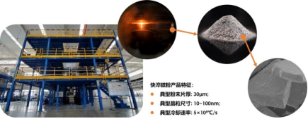快淬磁粉制备过程中,冷却速度高达105℃/s,典型粉末片厚30um,典型晶粒尺寸10-100nm。本项目开发出自主知识产权的快淬磁粉产业化成套制备技术,实现核心装备及部件的国产化,形成系列高端磁粉产品,打破国外企业的长期垄断。